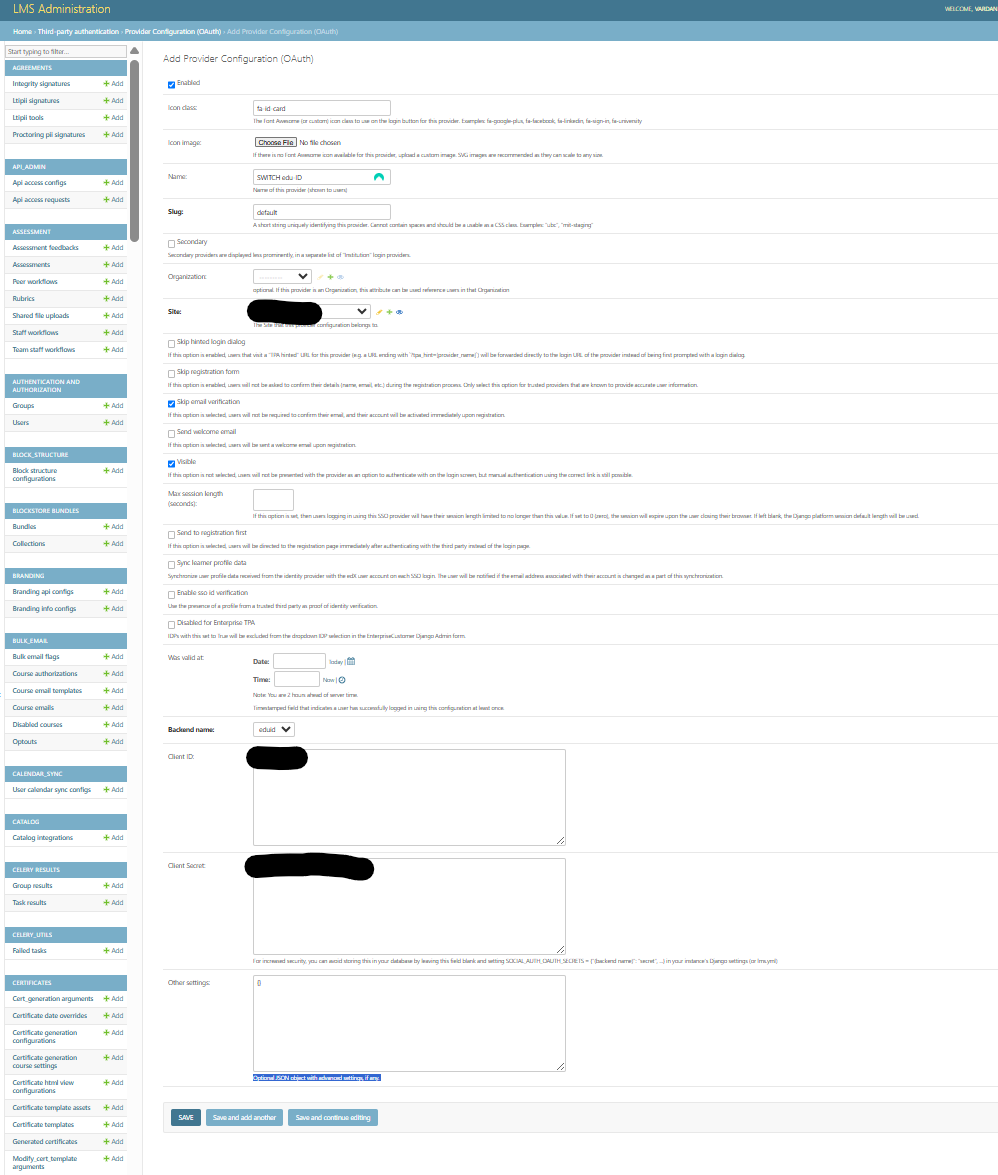 I registered my instance with the callback url {URL to your instance }/auth/complete/eduid/ on SWITCH. Once you register you get a client id and a secret .