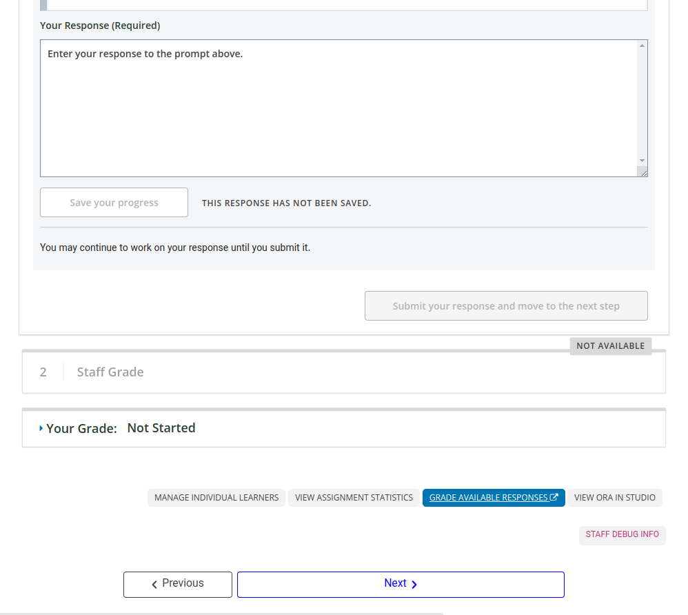 If you click on the “View all responses” button, you should see the submitted ORA. The problem happens here. IF the ORA has no file uploaded with it, everything is fine. You can see and grade it.